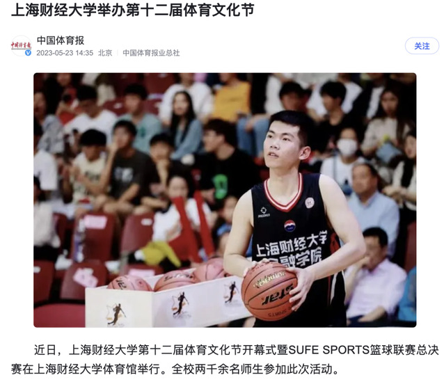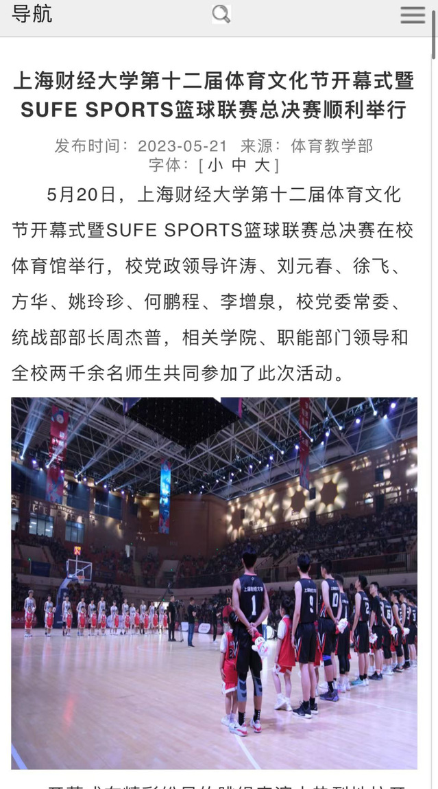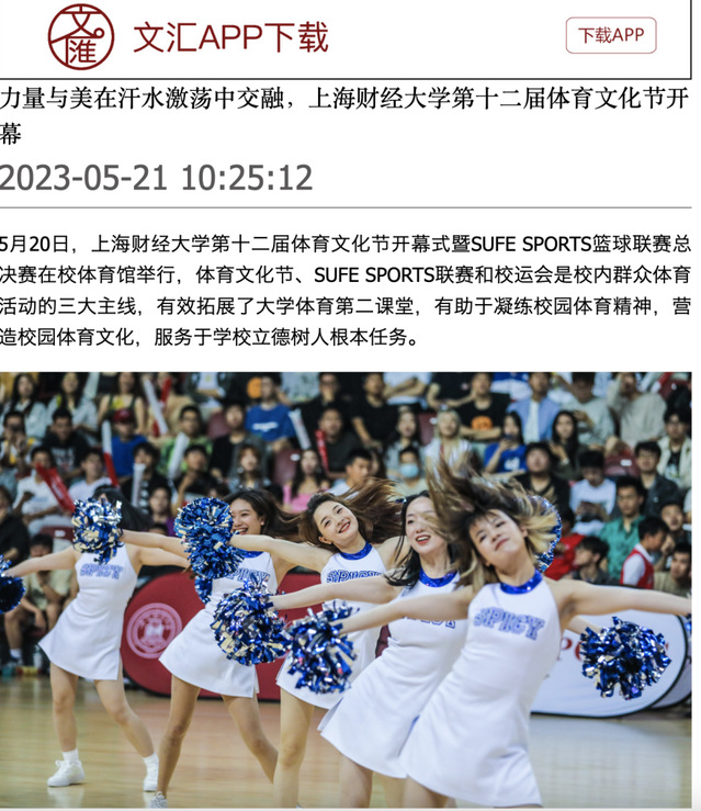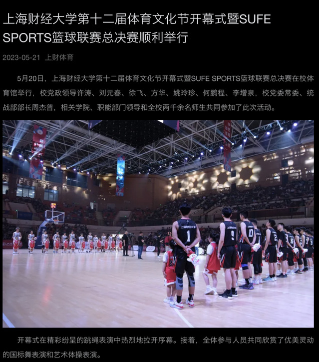 上海财经大学第十二届体育文化节开幕式暨SUFE SPORTS篮球联赛总决赛于5月20日在上海财经大学新体育馆如期举行。全校两千余名师生参加此次活动,期待已久的商学院与金融学院的篮球联赛总决赛展开角逐,赛场上双方球队你争我夺,场面激烈,球员们都展现出了良好的体育竞技精神,青春活力与拼搏精神在赛场上凝聚。同时,多家媒体也报道了我校这一场备受瞩目的篮球联赛总决赛。