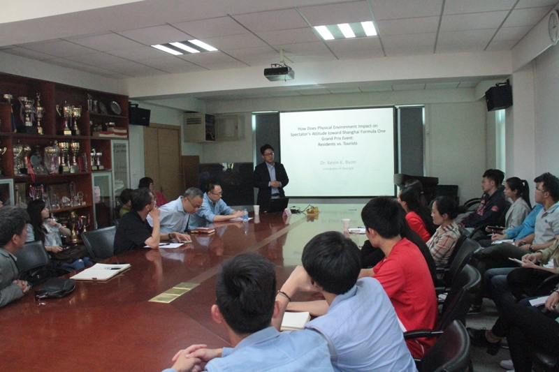 2015年5月12日下午3点,美国乔治亚大学终身教授Kevin K.Byon博士在体育教学部会议室为我校师生做精彩讲座,讲座题目为:How Does Physical Enviroment Impac on Spector's Attitude tomard Shanghai Formulua One Grand Prix Event:Resident vs Tourists。体育教学部全体教师、体育经营管理专业研究生、上海体育学院联合培养研究生及校内外感兴趣的师生出席讲座,体育教学部李洪斌副主任致欢迎词。Kevin 博士深入浅出、全面系统地向与会师生介绍了赛场物理环境中影响上海市F-1赛事观众忠诚度的重要因素,其研究目标选择、研究方案设置等都让与会师生有很大收获,会后,与会师生与Kevin针对体育产业管理专业的热点问题进行了深入讨论。