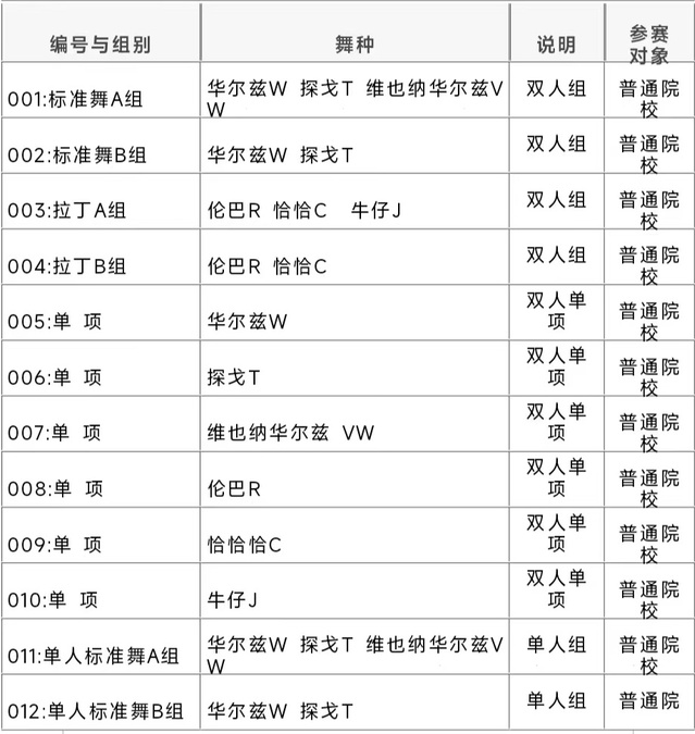 1、团体舞---表演舞人数:6---16人, 男女不限 时间:2-4分30秒舞种:以体育舞蹈为主要元素,3种(含)及以上舞种 ,动作自编 每个学校限报1支队伍。