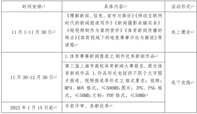 本活动主要分为培训和提交作品两部分。包括“阳光体育”大学生志愿者优培计划暨第三届上海市高校体育新闻大赛开班仪式、数字时代的体育新闻业务前沿相关线上理论课程、阳光体育新闻作品实践活动评比及交流、专家评审、颁奖及表彰等。活动期间费用由主办单位承担。