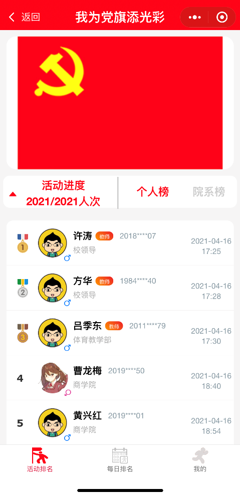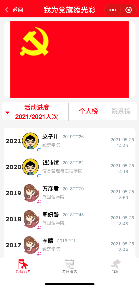 “献礼建党一百年,我与祖国同奋进”,上海财经大学 “我为党旗添光彩”接力跑活动针对全校师生,每次通过制定跑步APP在武东田径场打卡7.01公里,即可在“我为党旗添光彩”小程序中为党旗点亮一个色块。本活动自416号启动,截止525日,累计有2021人次完成了7.01公里跑,“我为党旗添光彩”小程序中党旗的2021个色块已经全部点亮。本次参与活动并完成7.01公里的师生将获得精美纪念章一枚,同时,在“1921”、“1949”、“2021”这三个特定顺序完成的三位同学还将获得神秘大奖一份。奖品领取方式我们会后续推出,请各位师生随时关注“上财体育”企业号的最新消息。