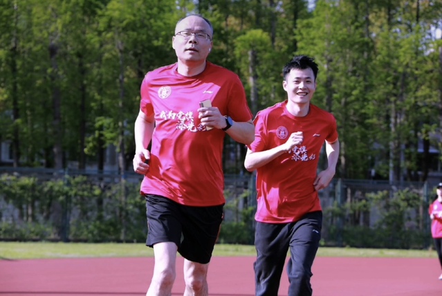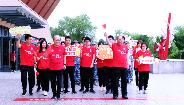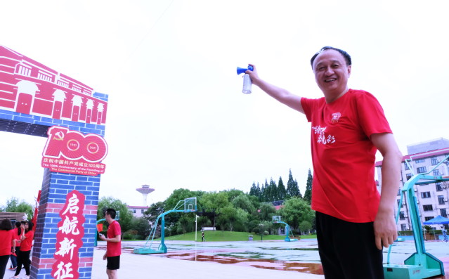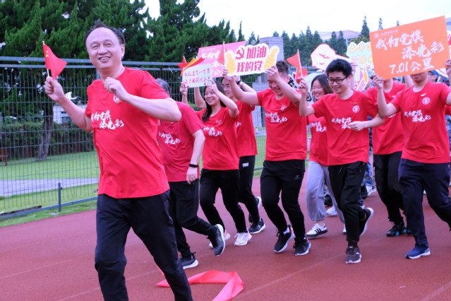 上午950分,体育教学部直属党支部杜富华老师宣布活动开始,许涛书记鸣笛开跑!他们带领千名师生在腾飞广场象征着中共一大地址的拱门奔跑到武东田径场象征着嘉兴南湖红船的拱门,完成了最后一公里,并合影留念,“我为党旗添光彩”活动圆满结束。