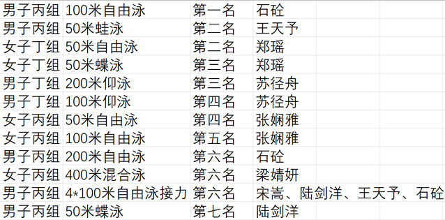 在教练徐燕军老师的带领下,上海财经大学高水平游泳队队员们赛出了水平,赛出了风采,展现出了勇于拼搏的体育精神。共计获得一金、两银、两铜、两项第四、一项第五、三项第六、一项第七。
