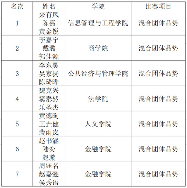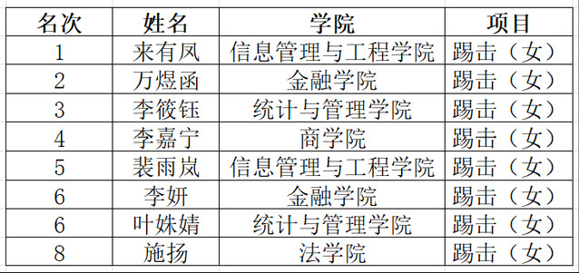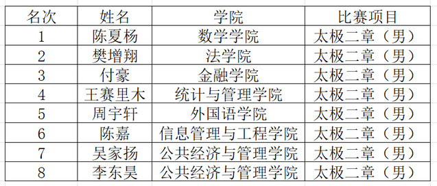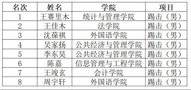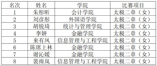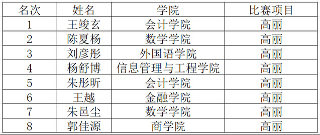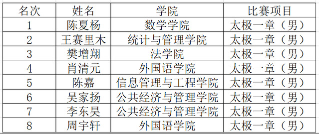 历经八十多场比赛的激烈角逐,每个项目决出前八名选手,现将名次公布如下:
