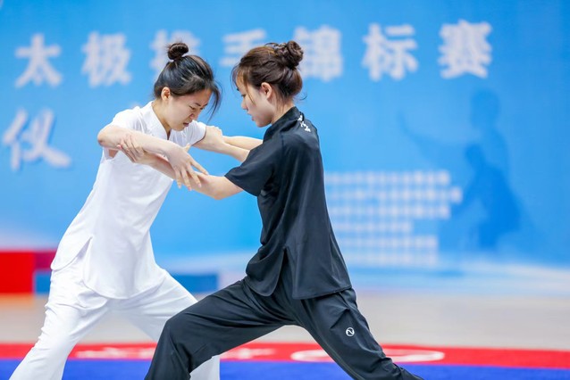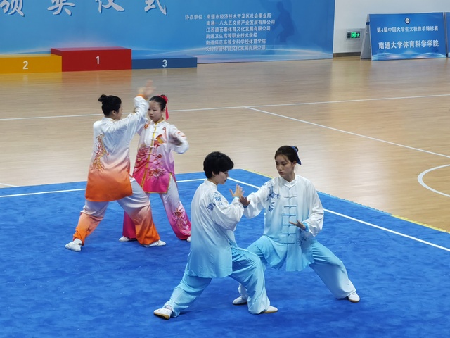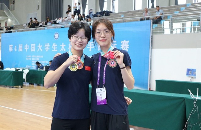 7月8日至7月13日,第四届中国大学生太极推手锦标赛在江苏省南通开发区盛大举行。大赛由中国学生体育联合会主办,南通市体育局、南通市经济技术开发区管委会与南通大学体育科学学院共同承办。比赛历时5天,来自全国各地的66所高校107支队伍500多名运动员围绕太极推手实战、太极类非遗项目展示、双人推手、团体竞技等项目展开较量,全面展现当代中国大学生武术套路竞技和太极推手的最高水平,用精湛技艺赓续博大精深的中华武术精神。我校武术队在教练文红为老师和辛晨曦老师的带领下,首次派出了2023级会计学院的陈溢灵和王语婕两位同学参加女子甲A组三个大项七个小项的激烈角逐,共获得1金2铜,1个第四,1个第五,1个第六的好成绩。