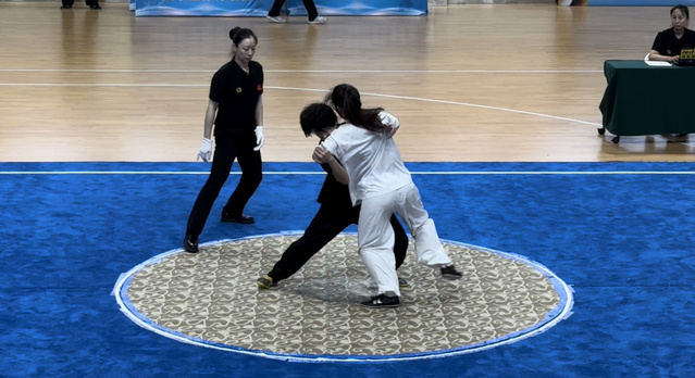 太极推手实战赛场,更是充满了紧张与刺激。选手们两两对决,展开了力量与智慧的较量。掤、捋、挤、按,采、挒、肘、靠,每一个动作都精准而有力,每一次对决都让观众热血沸腾。在这里,我们看到了青春的力量,也感受到了太极推手的魅力所在。我校学子在本次比赛中也崭露头角,陈溢灵同学面对强大的对手敢打敢拼,勇夺甲A组女子推手实战54公斤级第三名,为学校争得了荣誉。