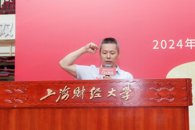 全国跳绳推广委员会副秘书长、中国跳绳国家队主教练、上海财经大学副教授蔡颖敏带领2024年中国跳绳国家队全体人员庄严宣誓:“一切以国家利益为重,遵守纪律,顽强拼搏,力争佳绩!”