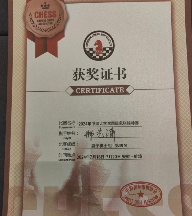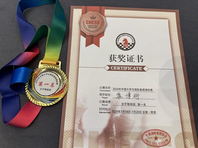 我校共派出2名棋手出战,2023级人文学院的蔡博珩以9轮8胜1平积8.5分领先第二名2分的较大优势获得女子等级组冠军,2021级金融学院的邢艺潇获得男子棋士组第四名的好成绩。