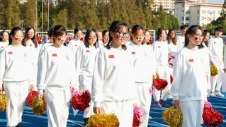 带阳光般的笑容,花球方队入场。她们尽情舞蹈,拥抱明天;飞扬的秀发,灵动的舞步,标准的动作都洋溢着青春的活力,形成一道靓丽的风景线。