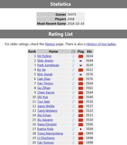 Goratings(围棋棋手排名)是基于go4go.net的棋谱资料和db.u-go.net的棋手资料,通过WHR算法生成,每日更新的一个围棋世界排名统计。