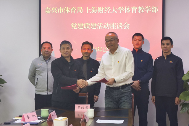 为深入推进融合式特色党建,加强基层党组织建设,实现部地党建双向赋能,以高质量党建推动体育事业发展,2024年12月21日下午,上海财经大学体育教学部直属党支部与嘉兴市体育局党总支党建联建签约仪式在嘉兴市体育局会议中心举行。上海财经大学体育教学部直属党支部书记吕季东,体育教学部副主任董敏凯,嘉兴市体育局党组书记钱永忠,党组成员、副局长朱忠良,党组成员、副局长蒋阳及相关同志等参与活动。嘉兴市体育局党组书记钱永忠主持会议。