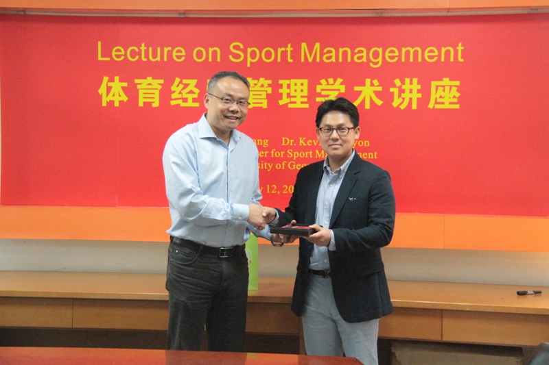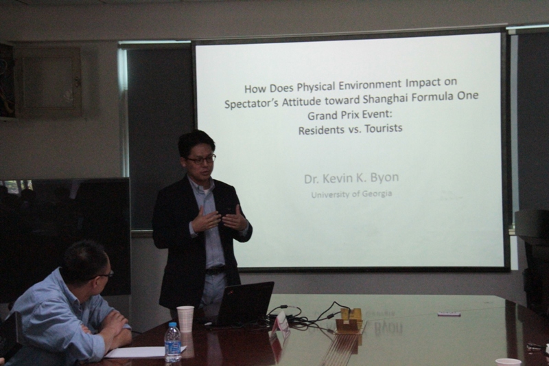 2015年5月12日下午3点,美国乔治亚大学终身教授Kevin K.Byon博士在体育教学部会议室为我校师生做精彩讲座,讲座题目为:How Does Physical Enviroment Impac on Spector's Attitude tomard Shanghai Formulua One Grand Prix Event:Resident vs Tourists。体育教学部全体教师、体育经营管理专业研究生、上海体育学院联合培养研究生及校内外感兴趣的师生出席讲座,体育教学部李洪斌副主任致欢迎词。Kevin 博士深入浅出、全面系统地向与会师生介绍了赛场物理环境中影响上海市F-1赛事观众忠诚度的重要因素,其研究目标选择、研究方案设置等都让与会师生有很大收获,会后,与会师生与Kevin针对体育产业管理专业的热点问题进行了深入讨论。