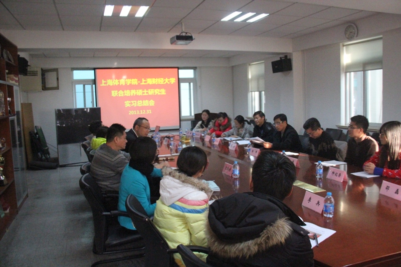 2013年12月31日,上海财经大学-上海体育学院合作建设研究生实践教学基地工作阶段总结会在体育教学部二楼会议举行。上海体育学院研究生处吴瑛处长、杨烨副处长、体育教育训练学院吴贻刚院长、我校体育教学部吕季东主任、硕士生导师和体院联合培养硕士研究生等出席会议。吕季东主任首先介绍了2013年实践基地的运行情况,并对各位研究生的实习情况进行了总结,吴瑛处长和吴贻刚院长对实践基地的运行情况给予了高度评价,双方对实践基地的建设和发展方案进行了深入探讨。