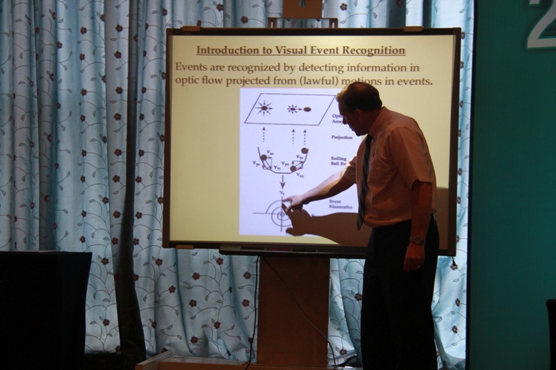 作为本次论坛的核心议题,动作技能与心理研究从一开始就引起了大家的强烈兴趣。宾汉姆教授长期致力于以生态心理学方法探究人类知觉与运动的关系的研究,他的诸多研究课题充分展现了实验心理学和运动学有机结合的巨大魅力。本次论坛,他首先运用光电技术的实验模拟方法向大家展现了人体运动的特征,让大家耳目一新。接着,他列举了自己一系列的研究领域相关问题并作了充分的理论介绍。最后,他通过物理和力学的方法对视觉事件的识别提出了自己的观点和研究成果。宾汉姆教授批判了人对自身运动的感知,提出“人可以通过其他现象来感知自身的运动、信息产生于运动”的观点。