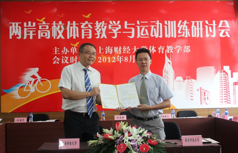 开幕式由上海财经大学(下称上财)体教部书记杜富华教授主持,体教部主任吕季东在会上致辞,向远道而来的宝岛学者表示感谢。屏东科技大学体育室主任吴崇旗、中央大学姚承义教授分别致辞,并表达了对未来两岸高校更密切合作地期待。随后,上海财经大学体教部与屏东科技大学体育室、休闲运动保健系正式签署了“两校体育合作与交流备忘录”,并互赠礼物。会议在一片掌声中正式开始。