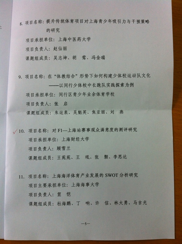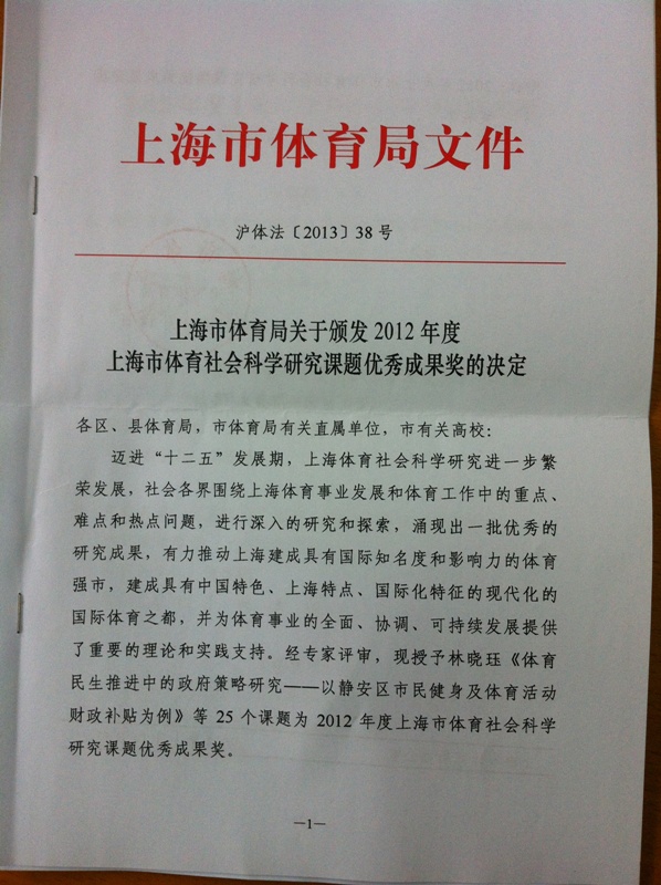 伴随着体育教学部学科建设的不断深入和科学研究的不断推进,一批有影响、有深度的科研成果不断涌现。近期,我部教师顾雪兰教授承担的课题《对F1-上海站赛事观众满意度的测评研究》荣获2012年度上海市体育社会科学研究课题优秀成果奖。