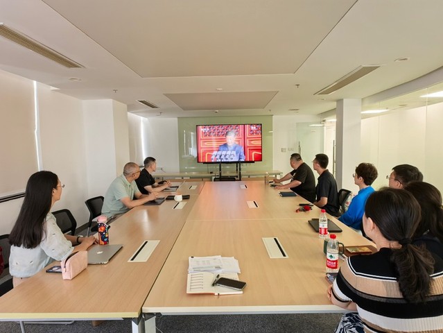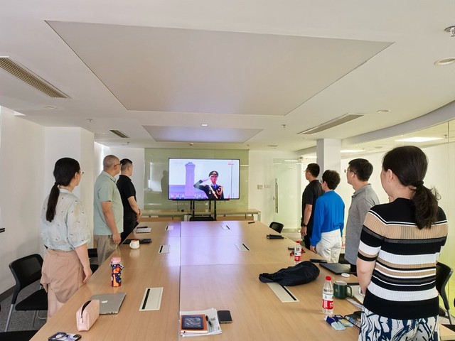 上午9时,体育教学部直属党支部书记吕季东带领中心组成员及部分在校教师在武东路校区13楼会议室集体观看阅兵直播。当威武雄壮的受阅方阵踏着《义勇军进行曲》的节奏昂首阔步时,现场不时爆发出热烈掌声。