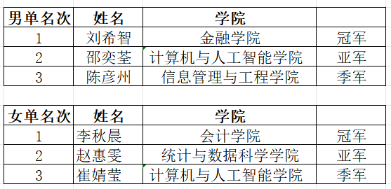 经过激烈的角逐,比赛成绩已经揭晓。男子单打冠军为刘希智,亚军为邓夷垠,季军为陈彦州。女子单打冠军为李秋晨,亚军为赵惠妤,季军为崔婧萱。参赛选手排名如图所示: