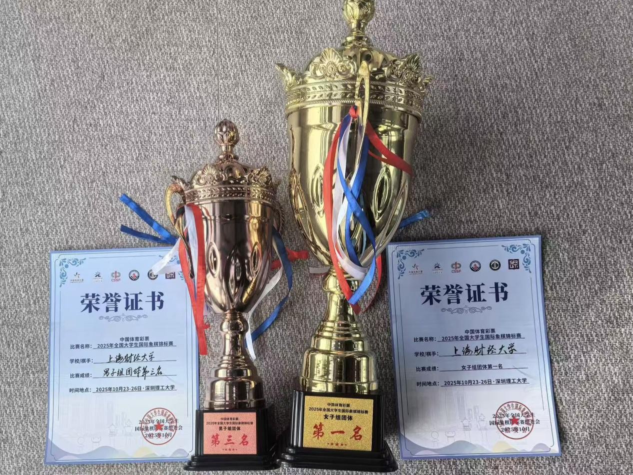上财学子奋力拼搏,发挥出色。国象队队长,新闻与社会高等研究院蔡博珩表现突出,在第三轮意外负于对手后迅速调整状态,取得五连胜,扭转局势,在女子个人组摘金,成功卫冕。会计学院张妤铉获得季军,财税投资学院郑心尔获得第五名。女子团体获得冠军。男子组,商学院蒋沁宇和新闻与社会高等研究院朱恒佚分别获得男子个人第四名与第五名,助力男子团体获得季军。