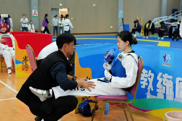 经济学院24级周子琪比赛中凭借过硬的技术,和精湛的腿法,力压强敌,在1/4决赛中更是以0:12的大分差零封对手,在半决赛当中,劲敌当前,奋力拼搏,力战未捷,最终摘得女子49公斤级铜牌。