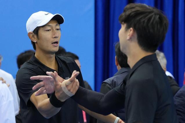 11月19日,江苏队组合唐盛(左)/孙浅在获胜后庆祝。