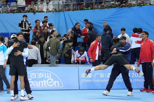 11月19日晚,在广东横琴举行的第十五届全国运动会网球项目男子双打决赛中,由上财学子唐盛/孙浅搭档的江苏队2比1战胜布云朝克特/郑展组成的浙江队,获得冠军。祝贺!