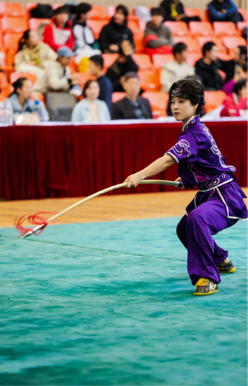 在高手云集的赛场,来自会计学院的賴曉弘同学南拳刚猛有力,步法沉稳扎实,一拳一脚皆藏千钧之力,取得了男子南拳第二名。经济学院的姚博瀚同学的棍术如蛟龙出海,棍影层层叠叠,进退之间章法严谨,棍随身走、身随棍动,最终获得第二名的好成绩。此外他的刀术行云流水,斩获第三名。法学院的彭丽娟同学在棍术比赛中,身形灵动轻盈,步法轻快飘逸,最终获得第三名。