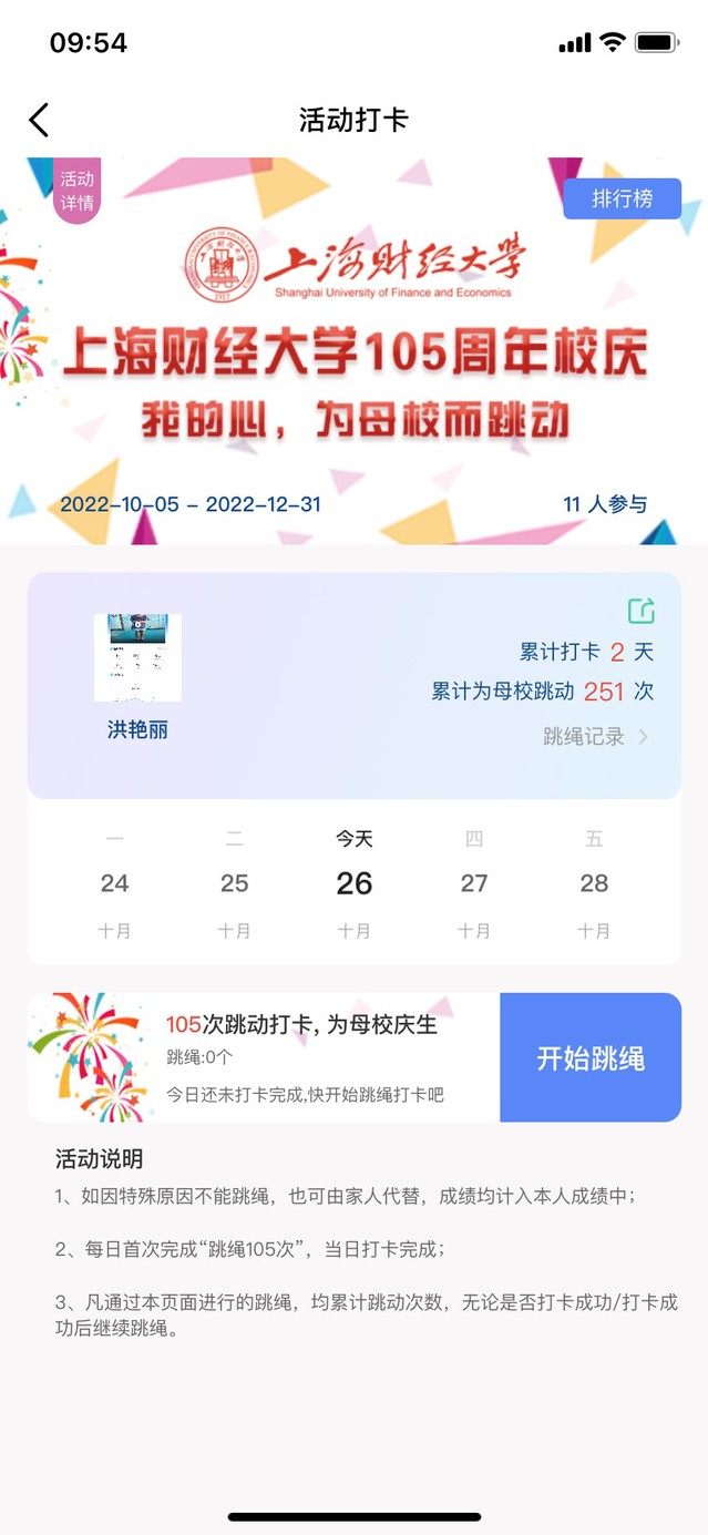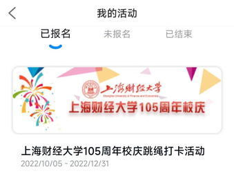 顶部为上海财经大学105周年跳绳活动,未报名用户可点击此处可进入报名认证,已报名用户点击此处可进入活动打卡页面。