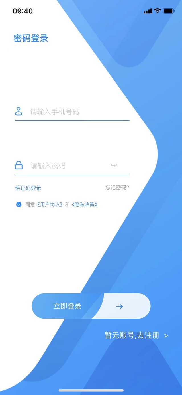 验证码登录:需输入11位手机号码,点击获取验证码,输入验证码后,需勾选同意《用户协议》和《隐私政策》,然后点击【立即登录/注册】系统校验成功后即为登录成功,进入首页。密码登录同理。