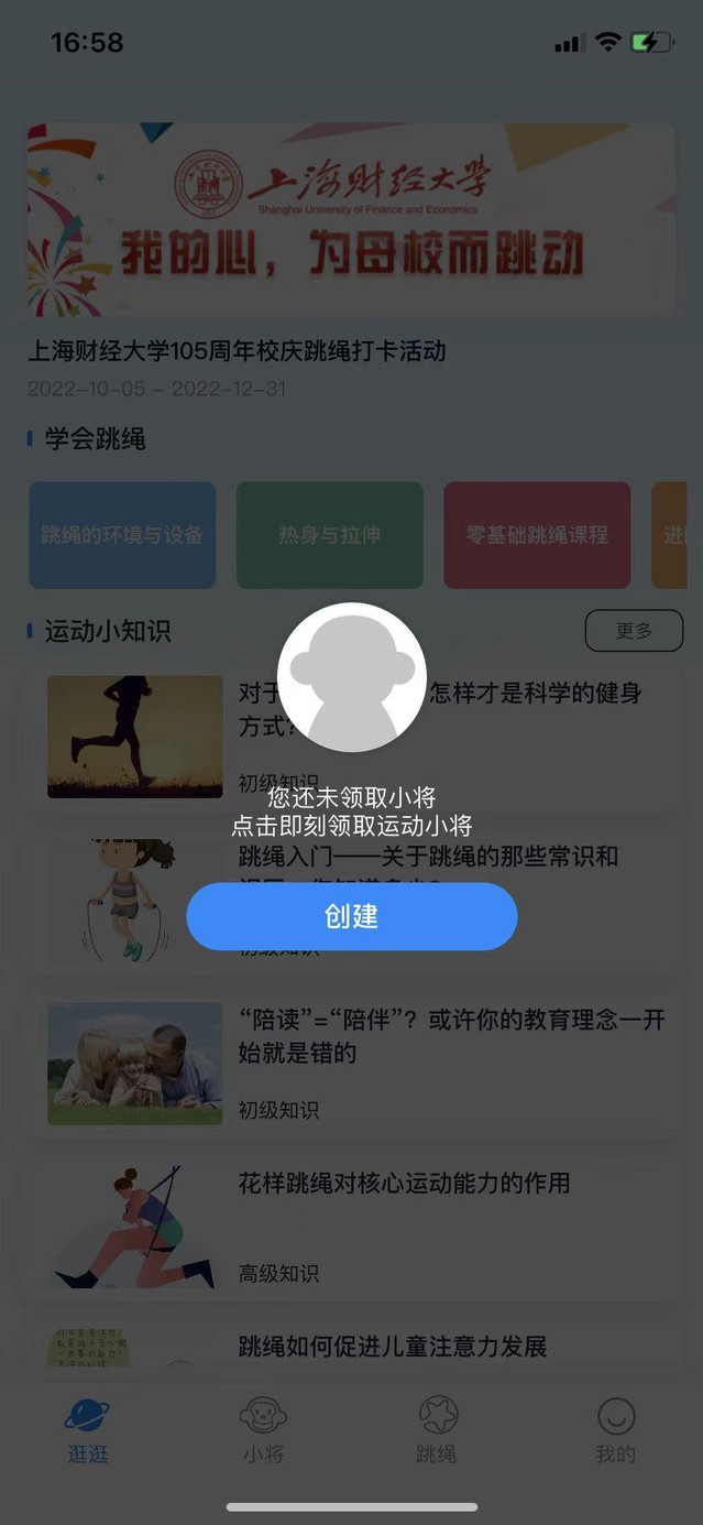首次登录注册后需要创建运动小将,点击【创建】领取您的专属运动小将