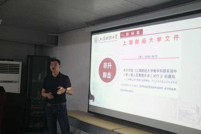 首先,董敏凯老师作为青年教师代表对大家关心的科研相关问题进行了汇报。董老师的汇报内容主要包括三个方面:第一,对我校教师职务任职条件的规定进行了详细解读;第二,对普通高校体育教师的发展、定位谈了自身感受;第三,结合自身实践,提出自我发展与合作交流相结合的建议。