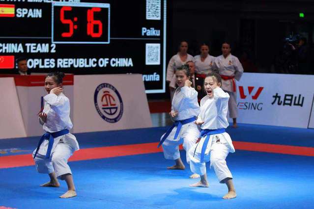 在比赛中,选手们均展示出了高超的空手道运动技巧,以及超强的团队协作能力,现场来自各个国家和地区的观众和教练时常鼓掌叫好。