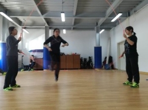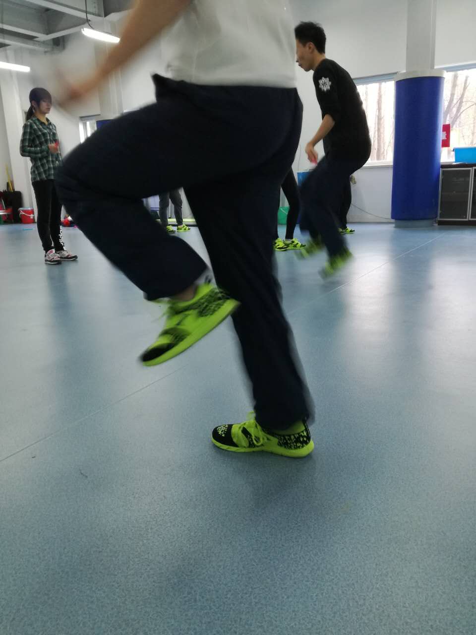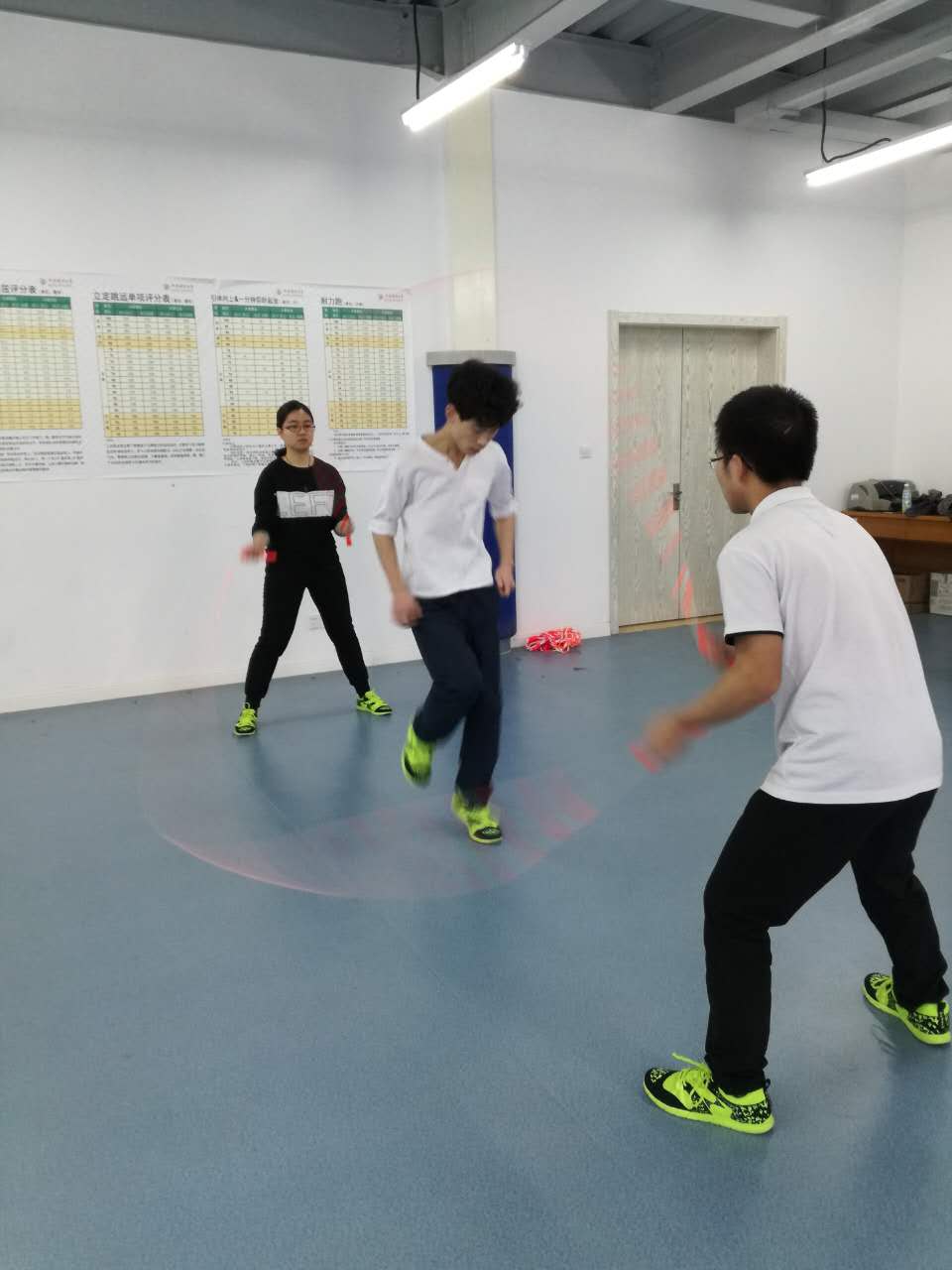 速度赛是比赛中非常重要的一部分,同时,速度练好了对多摇和其他花样的练习都有帮助。每天上午队员们要进行将近一个半小时的10秒,15秒,20秒,30秒个人速度练习,队员之间互相数个数,互相比较,互相学习,余下的时间进行交互绳速度练习,增强队员的摇绳能力和默契程度。
