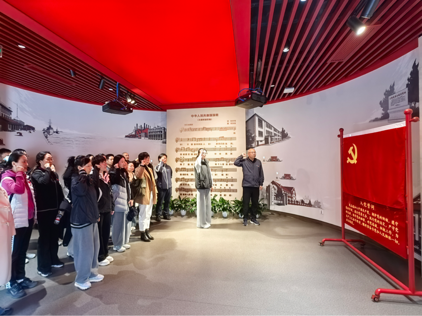 参观结束后,全体党员步入环幕影厅,共同观看了为主题短片《行远不忘初心》。影片回顾了国歌的诞生、抗战时期识别中国人、汶川地震中小学生齐唱国歌等待救援等标志性历史画面,从民族危亡时刻到新中国建设时期,展现了在国歌精神鼓舞下全国人民团结一致、奋勇向前的感人故事。随后,全体党员整齐列队,高举右拳,重温入党誓词,用铿锵有力的誓言表达不忘初心、牢记使命的坚定信念。