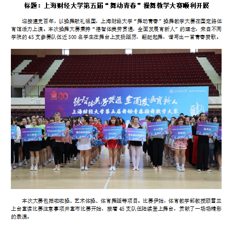 5 | 上海财经大学 | 上海财经大学第五届“舞动青春”操舞教学大赛顺利开展 | 姚予祺 | 二等奖 | |