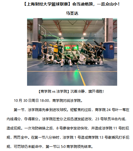6 | 上海财经大学 | 【上海财经大学篮球联赛】会当凌绝顶,一览众山小! | 马圣达 | 二等奖 | |